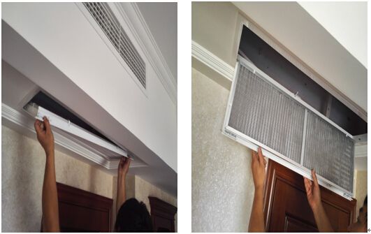 從出風(fēng)口和回風(fēng)口處取下的過(guò)濾網(wǎng),要用水沖洗至潔凈,可用小刷子搭配清潔劑仔細(xì)清潔。將清洗好的過(guò)濾網(wǎng)放在背光處晾干,然后將過(guò)濾網(wǎng)重新裝回出風(fēng)口,面板在吊頂上固定好,恢復(fù)風(fēng)口原狀。