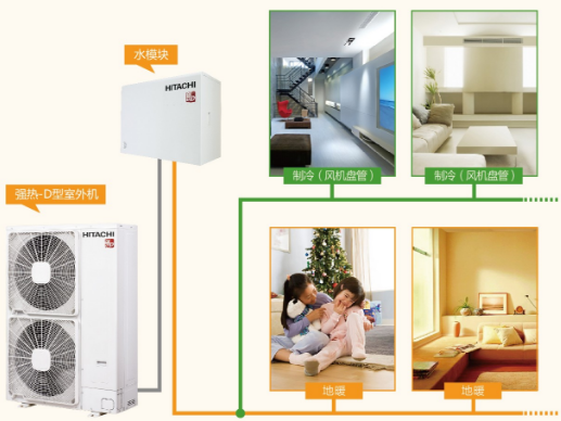 日立地暖+中央空調(diào)一體化系統(tǒng),是采用空氣源熱泵技術(shù),和中央空調(diào)共用一臺(tái)室外機(jī),只是在整個(gè)系統(tǒng)中間增加了一個(gè)水模塊,用來提升水溫,最后將熱水輸送到地暖盤管內(nèi),加熱地板,從而達(dá)到地板輻射取暖的目的。